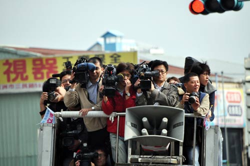 新北市長選舉進入倒數計時,選舉結果牽動藍綠版圖消長,媒體攝影記者隨車隊采訪掃街,鏡頭不放過每一個畫面。但擠在臨時充當采訪車的貨車上采訪,相當辛苦與危險。 “中央社”圖