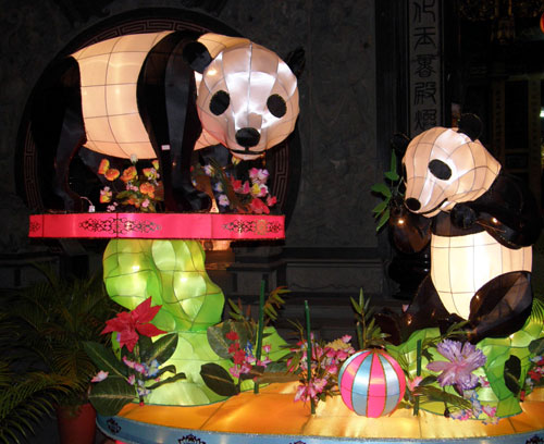 17日是元宵節(jié),高雄市多家廟宇設(shè)置花燈。四川大貓熊“團團”、“圓圓”是目前熱門話題,以熊貓為造型的花燈很流行。圖片來源:“中央社”