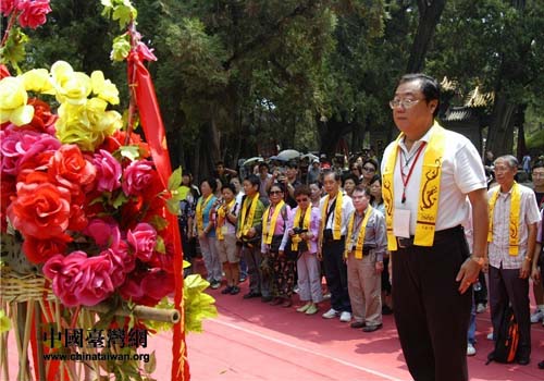 臺灣文化大學教授周談輝向黃帝陵敬獻花籃(陜西省臺辦 張群莉 攝)