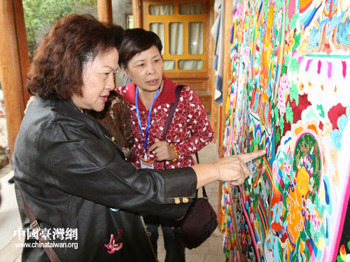 當(dāng)?shù)孛纴雒缞J的熱貢藝術(shù)文化不僅是青海高原特色文化的重要組成部分,更是中華民族優(yōu)秀文化遺產(chǎn)中的一朵奇葩。臺灣少數(shù)民族代表先后前往當(dāng)?shù)責(zé)嶝曀嚾酥摇⒍牙C之鄉(xiāng)、熱貢藝術(shù)館、熱貢畫院欣賞了由藏族熱貢藝術(shù)大師制作的唐卡、泥塑、堆繡、沙盤畫等作品。這些充滿藏族特色、內(nèi)涵豐富、制作精細(xì)的熱貢藝術(shù)精品讓臺灣少數(shù)民族代表嘆為觀止。高雄團(tuán)團(tuán)長謝垂耀表示,熱貢藝術(shù)是藏民族勤勞與智慧的結(jié)晶,是一項偉大的藝術(shù)成就,其將佛教典故以唐卡、壁畫、堆繡的形式表現(xiàn)出來,將抽象的佛教典故具體化、藝術(shù)化,非常有特色。精美的熱貢藝術(shù)品不僅體現(xiàn)了藏族藝術(shù)家的高超技藝,其少則幾月多則幾年的創(chuàng)作時間和繁多的制作工序,更凝結(jié)了藝術(shù)大師的辛勤與汗水,折射著藏族吃苦耐勞、堅忍不拔的性格。特別是唐卡等以礦物質(zhì)材料制作的熱貢藝術(shù)品,經(jīng)得起歲月的考驗,就如同熱貢藝術(shù)館那幅世界上最大的沙盤畫一樣,未來一定會成為偉大的藝術(shù)精品;ㄉ張F(tuán)團(tuán)長陳凱莉女士表示,因熱貢藝術(shù)作品內(nèi)容多是藏傳佛教典故及人物,充滿了宗教的靈氣,內(nèi)容豐富,工藝精湛,色彩亮麗,令人驚嘆,是世界性的藝術(shù)極品。