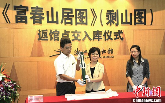 9月14日上午10時(shí),浙江省博物館在孤山館區(qū)報(bào)告廳舉行《富春山居圖》(剩山圖)返館點(diǎn)交入庫儀式。中新社發(fā) 江耘 攝