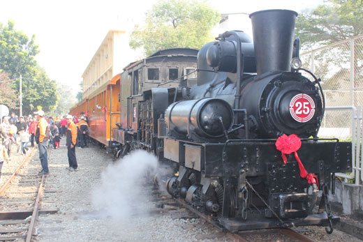 阿里山森林鐵路通車100年,嘉義林管處25日出動25號老車頭,拖著檜木車廂,免費供民眾搭乘。 圖片來源:“中央社”