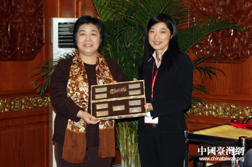 中國宋慶齡基金會聯絡部副部長宋建(左)和臺灣十杰基金會人員互贈禮物