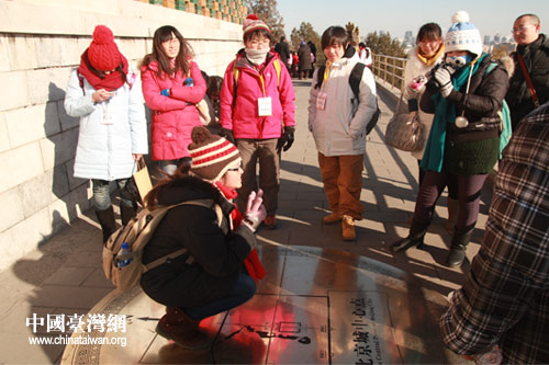 臺(tái)灣學(xué)生在北京城中心點(diǎn)拍照留念。(中國(guó)臺(tái)灣網(wǎng) 郜利敏 攝)
