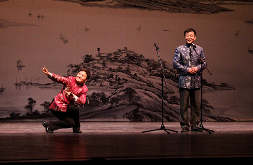 國家一級相聲演員李偉建、武賓表演的相聲《天天習舞》以說唱結合的表演方式,形象生動的肢體動作,讓在場觀眾無不前仰后合,拍手叫好,兩度返場演出,讓本是同根同源的兩岸文化交流沒有任何距離。應寧、王磊表演的對口相聲《講四書》以風趣幽默的表演方式,融入當地語言元素,充分展現了中華民族的文化魅力。劉穎、浩楠表演的相聲《減肥》以反諷的方式結合熱點話題,用詼諧幽默的語言,既愉悅了觀眾又展示了中華民族的語言魅力。這些精彩的語言藝術表演,讓當地民眾更直接了解中華民族傳統文化,感知兩岸親情,認同同根同源。北京雜技團的《女子雙人柔術》運用各種“頂”的技巧和“連續軟翻”、“雙人造型”等優美動作征服了在場的每位觀眾。年輕魔術演員王璐的魔術《伊人花影》,如夢如幻,也為臺灣觀眾留下了深刻的印象。臺北曲藝團的快板演員林文斌也同臺獻藝,表演了快板《武松打店》。