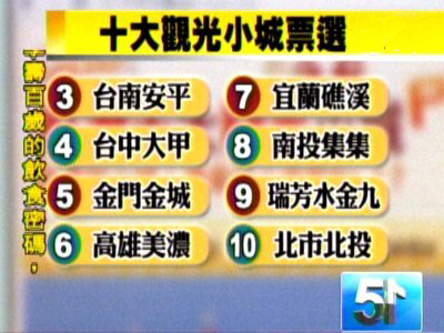 觀光小城后幾位,依序為臺南安平、大中大甲、金門金城、高雄美濃、宜蘭礁溪、南投集集以及瑞芳和北投。(中國臺灣網 李帥)