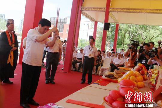 10月13日上午,為期3天的2012臺北客家義民嘉年華在臺北市客家文化主題公園開幕。圖為“安座大典”上,臺北市長郝龍斌作為主祭官,在神壇前上香,敬拜義民爺。楊杰 攝