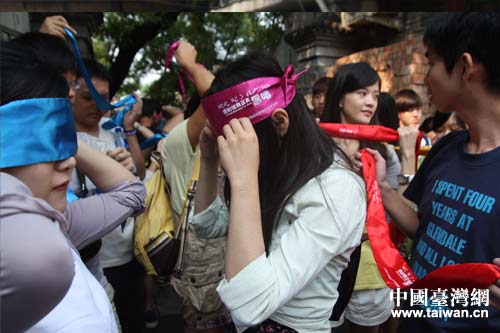 臺灣青年學(xué)生蒙眼準(zhǔn)備進入活動中心。(中國臺灣網(wǎng) 雍紫薇 攝)