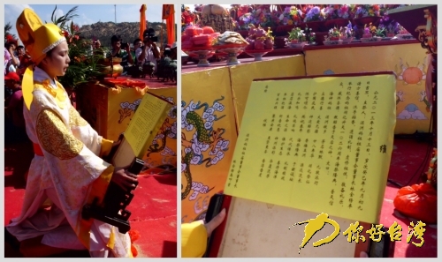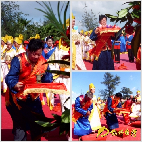 14點18分,象征財如水漲的海水開始漲潮,青浦底海灘上擂鼓三通,海螺長鳴,禮炮九響恭請媽祖金身安座,海祭儀式正式開始。