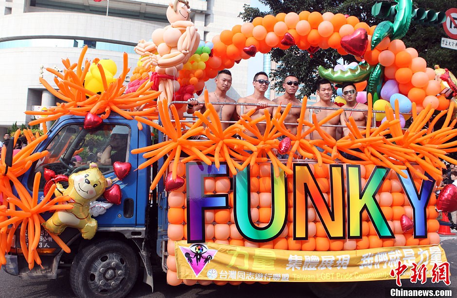 10月26日,號稱亞洲最大規模的“同志”(同性戀者)大游行下午在臺北登場,數千人走上街頭,精心打扮爭奇斗艷。圖為游行前“同志們”在臺北市政府廣場前集結。陳立宇 攝
