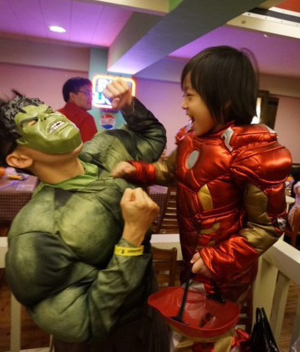 中國臺灣網10月31日消息 據臺灣媒體報道,今天是萬圣節,林志穎與兒子Kimi未能免俗也玩起角色扮演,林志穎扮成綠巨人,Kimi則是鋼鐵人,兩人還玩起對打,爸爸林志穎理所當然得成為兒子的手下敗將。網友看了直呼好可愛,也覺得Kimi好幸福,有個好爸爸。(中國臺灣網 朱煉)