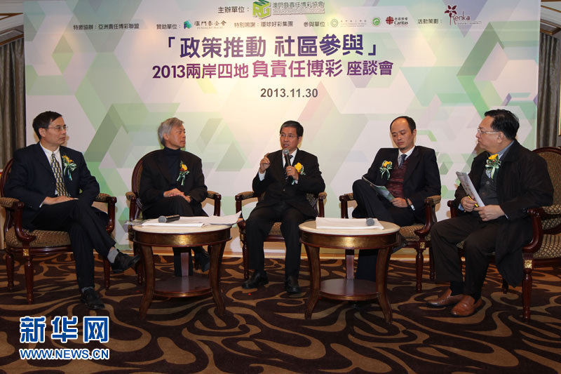 當(dāng)日,由澳門(mén)負(fù)責(zé)人博彩協(xié)會(huì)主辦的2013兩岸四地負(fù)責(zé)任博彩座談會(huì)在澳門(mén)舉行,來(lái)自?xún)?nèi)地及港澳臺(tái)的專(zhuān)家學(xué)者就澳門(mén)博彩業(yè)及澳門(mén)經(jīng)濟(jì)多元化發(fā)展進(jìn)行了探討。 新華社記者 程光明 攝