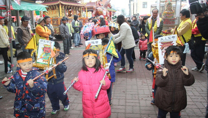 鹽水小學學生抬神轎到武廟慶祝蜂炮活動展開。來自臺媒