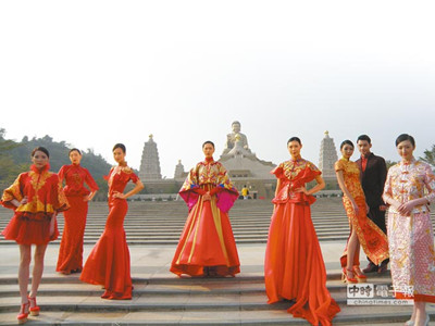 其中“鸞鳳報喜”系列,更是張志峰與他的女兒一起設計,也是張志峰最得意的作品。他強調(diào)婚姻是一種緣分,一條紅線,三生緣定,服裝設計上特別使用中國人傳統(tǒng)喜愛的紅線,象征“千里姻緣一線牽”,展現(xiàn)東方禮制服飾文化。