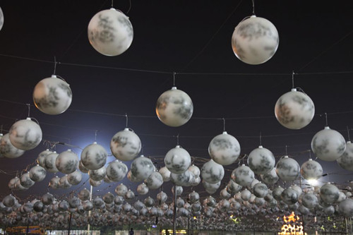 “‘月之魂’部分的2498個‘月亮’,時間軸從建城時起到2014年,每一個“月亮”代表一年;每盞燈由直徑0.6米的小球組成,為了達到逼真效果,設計人員用半透明半鏡面的涂刷方式來實現月亮斑駁的藝術效果,亮燈的時候就跟真實的月亮一樣,非常震撼!崩枞航榻B。
