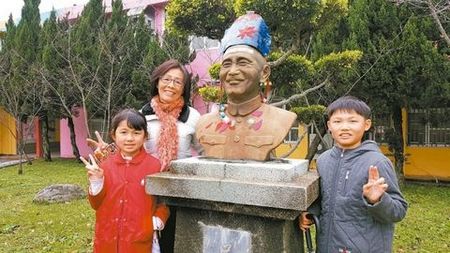 苗栗縣興隆小學大門內的蔣介石銅像,換過太后造型。來源:臺灣《聯合報》