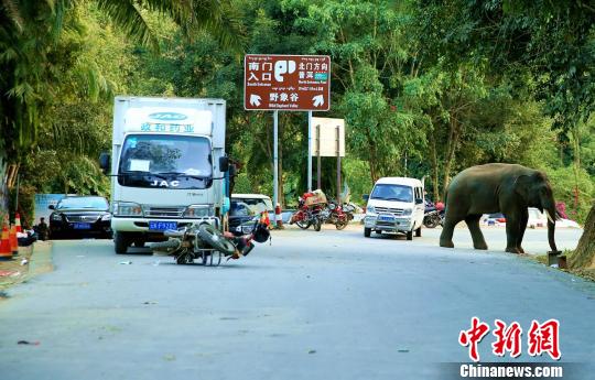 圖為新晉“網紅”野象“獨筍牙”又溜到野象谷大門攔路玩車 常宗波 攝