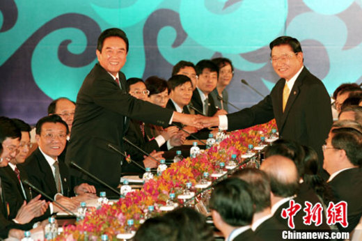 12月21日上午,海協會會長陳云林與海基會董事長江丙坤的兩會領導人第六次會談在臺北圓山飯店登場。圖為陳江二人在會談開始時相互握手致意。 中新社記者 黃少華 攝