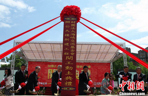 資料圖:2010年9月25日,臺灣海基會新辦公大樓在臺北市中山區(qū)開工動土。圖為臺灣行政當局負責(zé)人吳敦義(左4)、海基會董事長江丙坤(右4)、“陸委會主委”賴幸媛(左1)、辜振甫先生夫人辜嚴倬云女士(右3)與各界人士共同出席動土典禮,祝賀海基會有了“新家”。中新社發(fā) 劉舒凌 攝