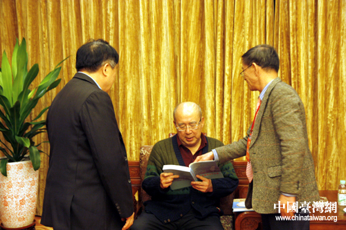 11月23日,中國國民黨榮譽(yù)主席吳伯雄在梅州會(huì)見蕉嶺籍大陸學(xué)者徐博東等,圖為徐博東、黃志平向吳伯雄贈(zèng)書(中國臺(tái)灣網(wǎng)記者 蕪?fù)?攝)