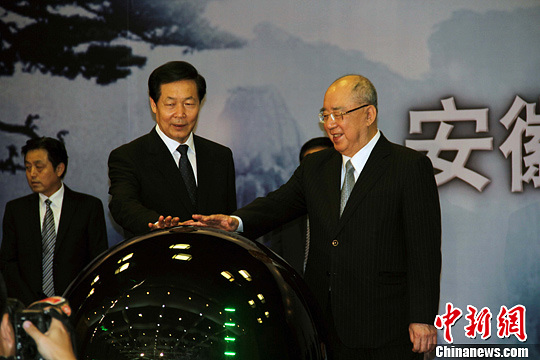 圖為中國國民黨榮譽主席吳伯雄(右一)和中共安徽省委書記張寶順(右二)共同啟動交流活動開幕式。中新社發 吳衛中 攝