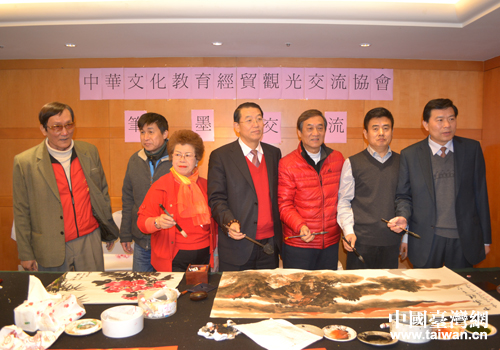 中國臺灣網2月13日臺北消息 2月12日,應中華海峽兩岸企業交流協會邀請,來臺出席第三屆高雄燈會節暨北京特色周活動的大陸書畫名家與臺灣知名書畫家在臺北舉行交流筆會。臺灣中華文耀文教經貿交流協會理事長、臺灣畫家呂玉環主持筆會,程茂全、張和平、王興家、慕云五等與臺灣畫院副院長盧錫炯合作獻藝,共敘友情賀新春。(中國臺灣網北京通訊員 郭寧 王正智)
