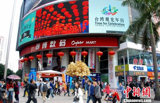 2月15日至28日,臺灣海峽兩岸觀光旅游協會北京辦事處在深圳華強北賽博廣場及東門金世界百貨外投放兩塊大型戶外LED屏幕,以“臺灣觀光年歷”各式節慶活動為主題推介赴臺游。 臺旅會供圖 攝