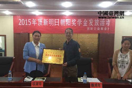 在獎學金發放儀式上,克什克騰旗副旗長項淑華向頂新公益基金會理事長騰鴻年,贈送了“捐資助學先進集體”的牌匾(中國臺灣 蕪同攝)