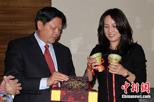 1月12日,“七彩云南 文化驚艷”民族文化交流訪問團在臺北舉行記者會。該訪問團將于近日在臺灣正式演出9場,交流演出3場,并有數(shù)場座談會。圖為高金素梅(右)與云南省臺辦主任巖莊茶敘,共同欣賞色彩絢麗的花腰傣民族工藝品。中新社記者 甘娜 攝