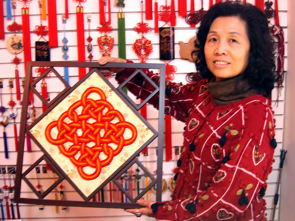 “麒麟呈祥”、“彩蝶比翼”、“魚躍龍門”、“十二生肖”……臺商林淑麗的小店里陳列著各式各樣色彩繽紛做工考究的中國結(jié)編織藝術(shù)品。20年前,她跟隨丈夫千里迢迢來到云南昆明,擅長女紅的她在祥云街8平米的店鋪里賣起了“中國結(jié)”。