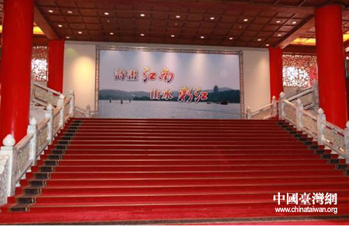 圓山飯店大堂內(nèi)巨大的“詩(shī)畫(huà)江南,山水浙江”背景板。(浙江省臺(tái)辦王健 攝)