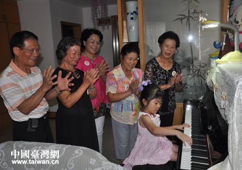 臺灣客人在來芬琴家聽她孫女彈鋼琴。