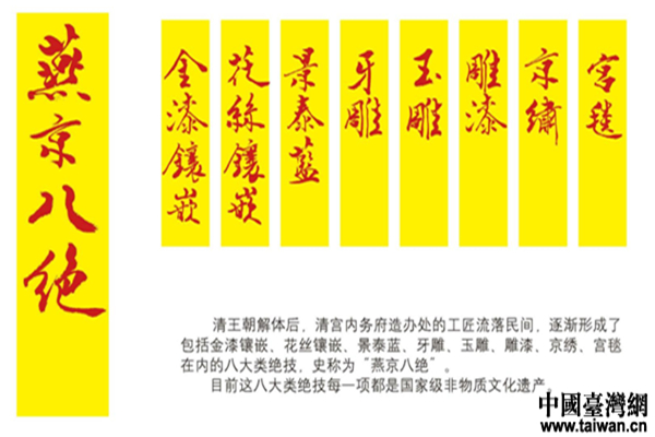 “燕京八絕”具體指的哪八絕?――景泰藍、玉雕、牙雕、雕漆、金漆鑲嵌、花絲鑲嵌、宮毯、京繡。柏群介紹,以“皇家工藝”為代表的“燕京八絕”,曾在明清時期盛極一時,開創了中華傳統工藝的高峰。隨著近期電視劇《延禧攻略》和《如懿傳》在兩岸的熱播,宮廷風一時間風靡兩岸。柏群說:“在兩岸的文化交流過程中可以感覺到大家對具有‘皇家風范’的‘燕京八絕’的還是很有興趣的。”