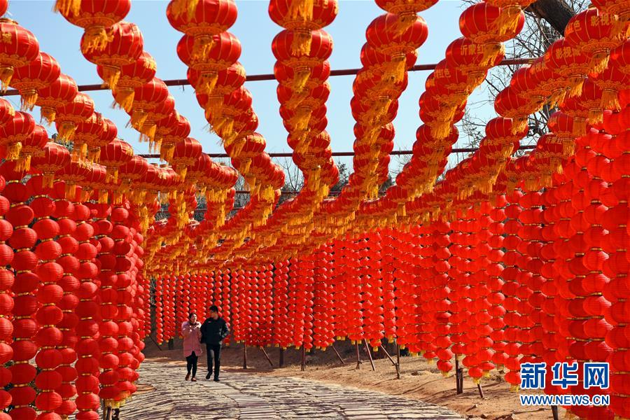 2月13日,在山東省沂南縣馬牧池鄉(xiāng)常山莊村,行人從紅燈籠下走過。春節(jié)將至,各地紅紅火火,一派喜氣景象。 新華社發(fā)(史連贏 攝)