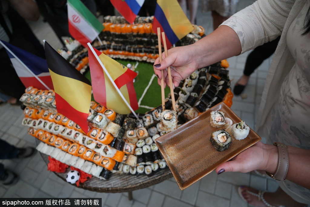 當地時間2018年7月5日,俄羅斯喀山,Yakitoriya餐廳推出一款壽司球場,迎接俄羅斯世界杯1/4決賽俄羅斯VS克羅地亞。據悉,這款球場共使用了6000個壽司,重達85kg。