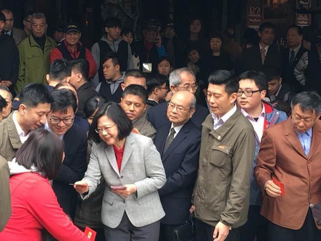 蔡英文發(fā)放紅包,臺(tái)北市長(zhǎng)柯文哲在一旁。(圖片來(lái)源:臺(tái)灣“中時(shí)電子報(bào)”)
