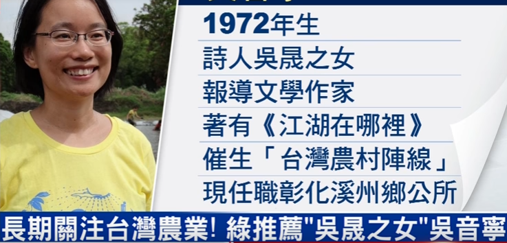 而她的父親吳晟是臺灣鄉土文學作家,創作以新詩為主、散文為輔,寫作之余亦從事農事,2017年被蔡英文辦公室聘任為“資政”。