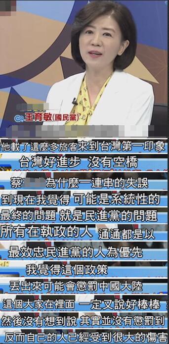 國民黨“立委”王育敏直言,這就是民進黨的問題所在:只要牽扯到可能懲罰到大陸的措施,綠營內部就都會拍手叫好,但其實還沒懲罰大陸,臺灣自己人就先受到很大傷害了。