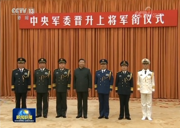習(xí)近平向晉升上將軍銜的張升民頒發(fā)命令狀