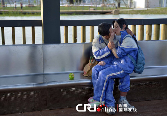 2013年5月24日,福建漳州碧湖生態(tài)園展出的中學生舌吻雕塑。