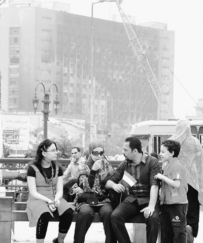4月27日,一家埃及人在首都開羅市中心的解放廣場上享受陽光。在他們身后不遠處,是位于尼羅河畔的已被燒毀的前執政黨總部大樓。