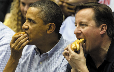 奧巴馬同卡梅倫在俄亥俄州觀看全美大學生籃球聯賽決賽,兩位領導人邊看比賽邊享用熱狗。