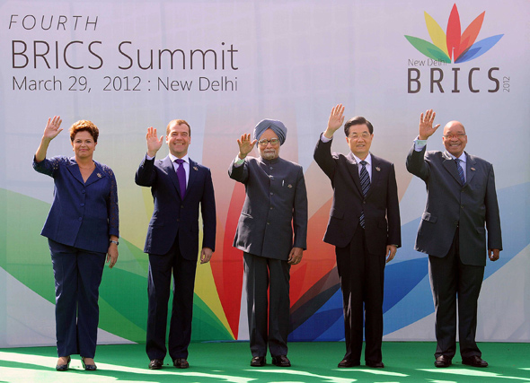 2012年3月29日,金磚國家領導人第四次會晤在印度新德里舉行。這是胡錦濤主席同巴西總統羅塞夫、俄羅斯總統梅德韋杰夫、印度總理辛格、南非總統祖馬合影。
