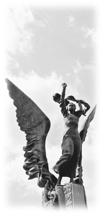 綏芬河市民用青銅為她塑起一座雕像。雕像就立在她最后上山的地方。她站在6米高的基座上,花崗巖形如石崖,嶙峋峭立。熔巖流出石縫,火焰在她身后升騰,化為雙翅,凌空招展。那火焰象征第二次世界大戰(zhàn)的戰(zhàn)火。她揮舞著臨行前媽媽送她的新頭巾……