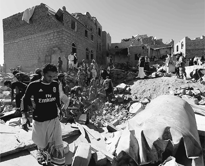 沙特阿拉伯等國戰(zhàn)機5月1日凌晨空襲也門首都薩那,一處平民區(qū)被炸。圖為人們清理空襲后的廢墟。