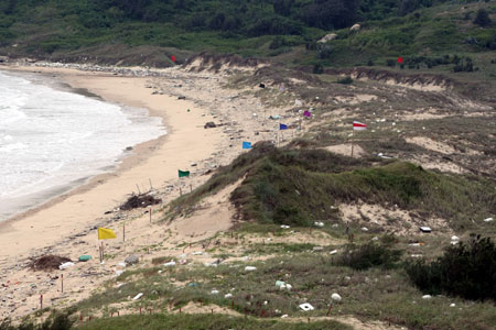 金門現(xiàn)有列管雷區(qū)一百五十三處,埋設(shè)地雷約七萬余枚。圖為金門山后海灘編號231-020雷區(qū)。