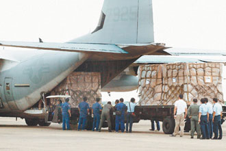 美軍軍用C130運輸機載運120卷軍用防水塑料布救災物質 臺灣聯合報圖