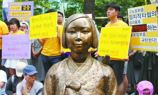 7月2日,在韓國首爾的日本駐韓國大使館前,民眾在“慰安婦”少女像旁手持標語參加抗議活動。要求日本政府向“慰安婦”謝罪,并強烈反對日本通過解禁集體自衛權的法案。新華社記者 姚琪琳攝