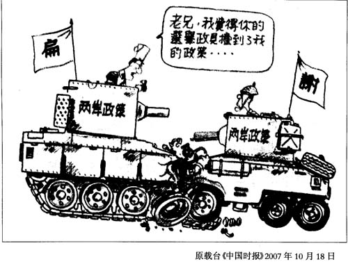 最近,民進黨“2008”參選人謝長廷為扭轉在選舉中民調落后局面以及為爭取工商界的支持,開始打“兩岸經(jīng)貿牌”,提出有條件開放兩岸經(jīng)貿政策的主張,但是受到陳水扁與深綠勢力的牽制,不得不一再退縮,陷于進退失據(jù)與兩難境地。。