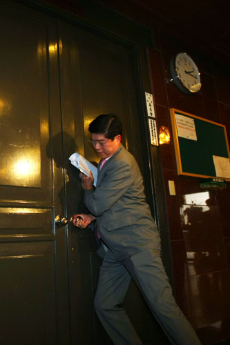 5月4日上午,臺“立法院”原定審查事關大陸學歷認證、開放大陸學生來臺的兩岸人民關系條例部分條文修正草案。圖為民進黨“立委”反鎖會議室、占據主席臺后,國民黨“立委”舉起要求正常開會的標語牌。 中新社發 耿軍 攝